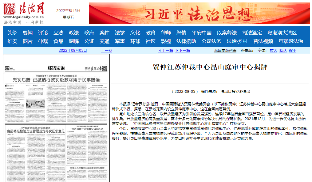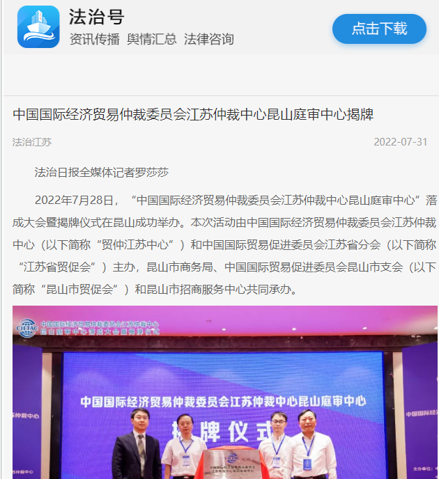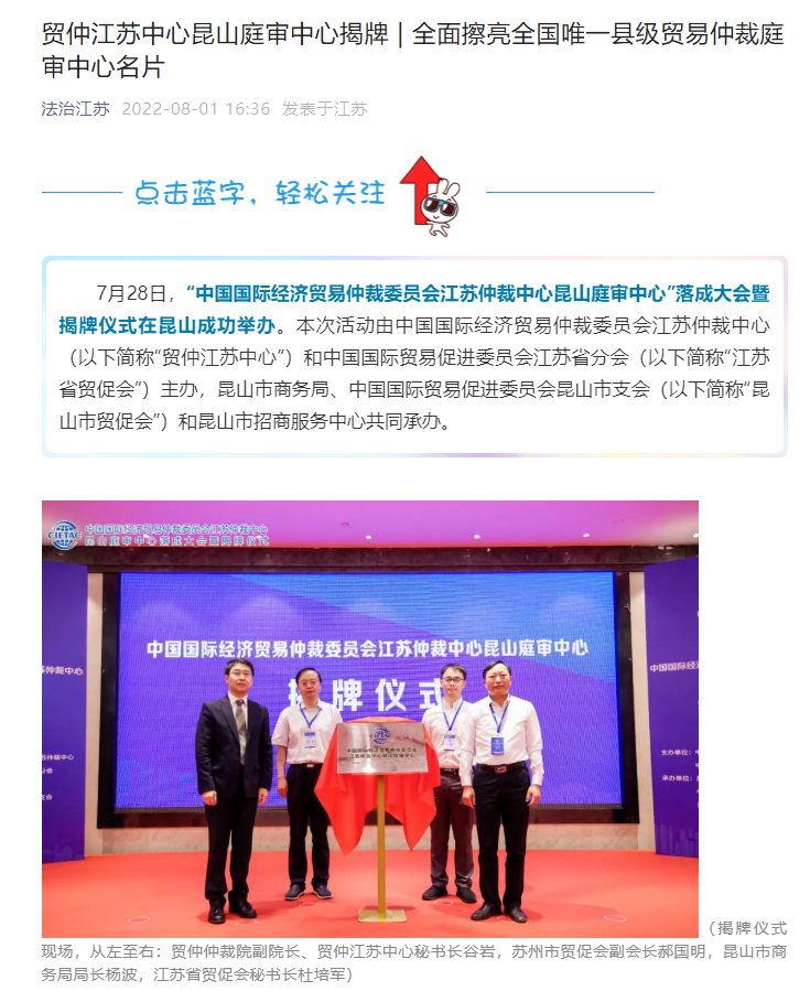 2022年7月28日,由贸仲江苏中心主办的“中国国际经济贸易仲裁委员会江苏仲裁中心昆山庭审中心”落成大会暨揭牌仪式在昆山成功举办。